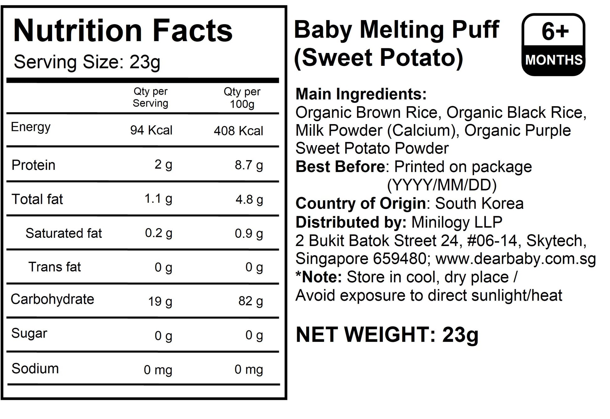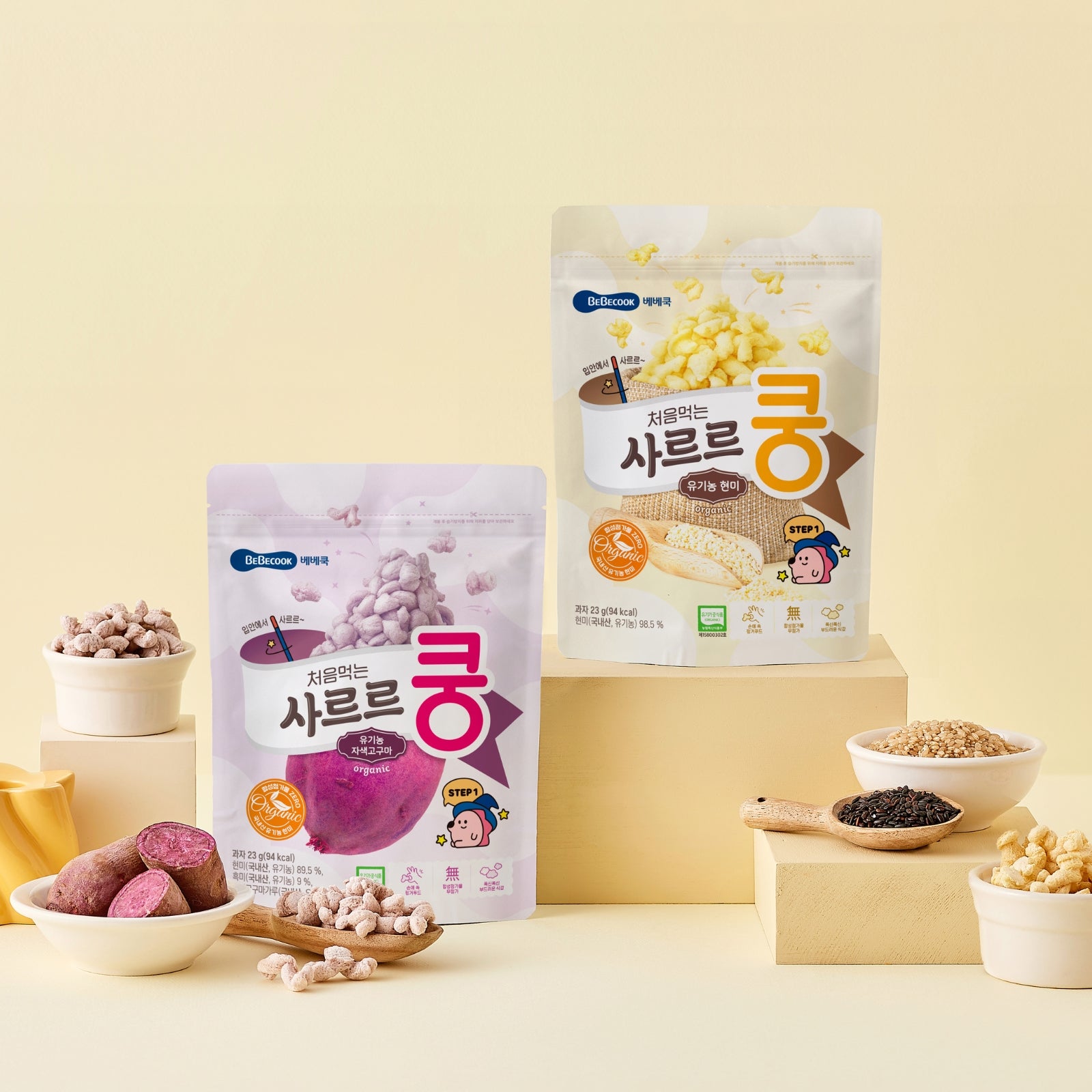 BeBecook Organic Baby Melting Puff is a certified organic snack, made from nutrient-rich organic brown rice using a high-pressure puffing method (without oil) retaining its natural taste and essential nutrients. These tasty puffs melt easily in the mouth and are sized for easy pincer grips. Free from artificial additives such as flavorings, colorings, seasonings and produced under a safe and clean HACCP management system. Packaged in a resealable pouch for freshness, they are an ideal choice for a healthier snack option for young children, both at home and on-the-go.
