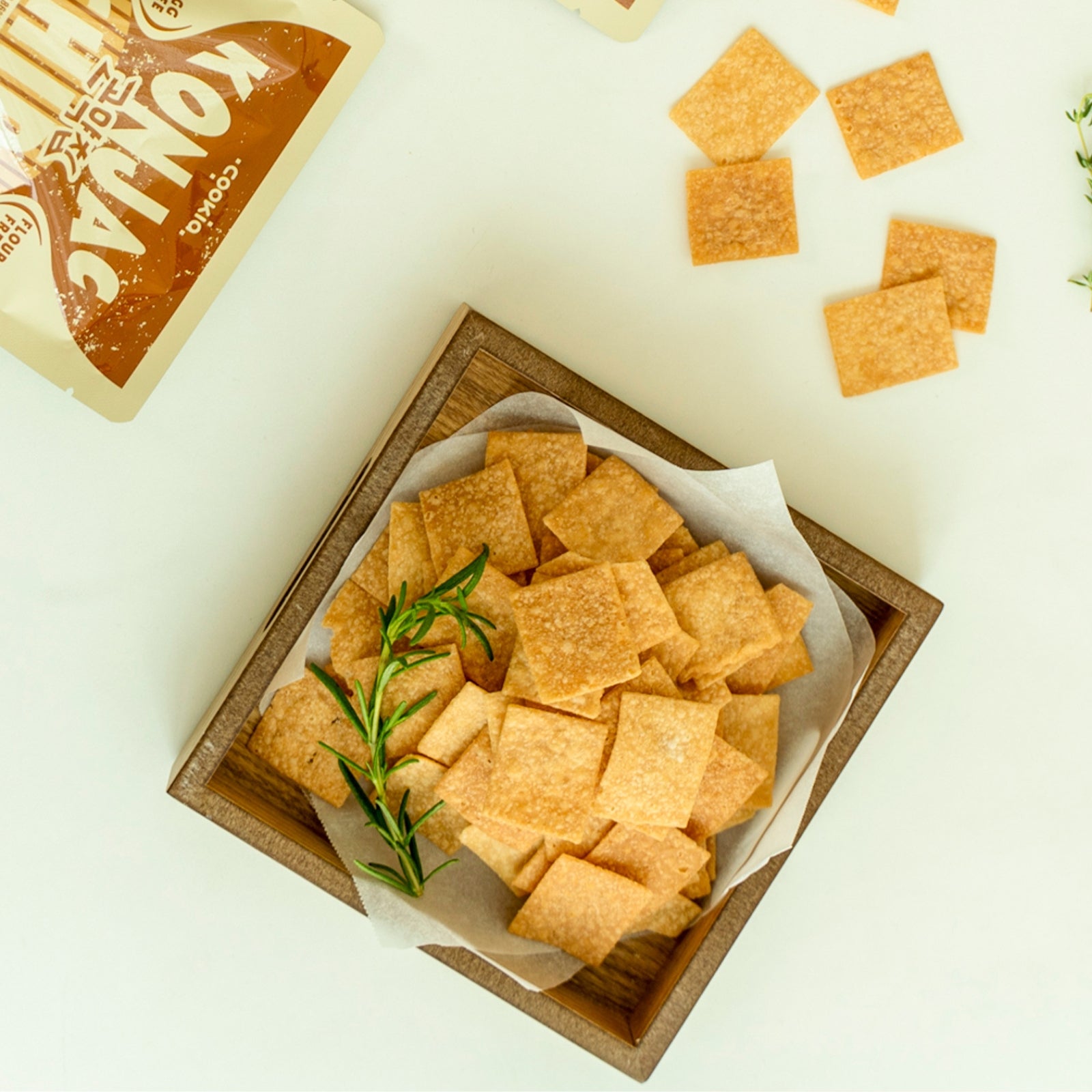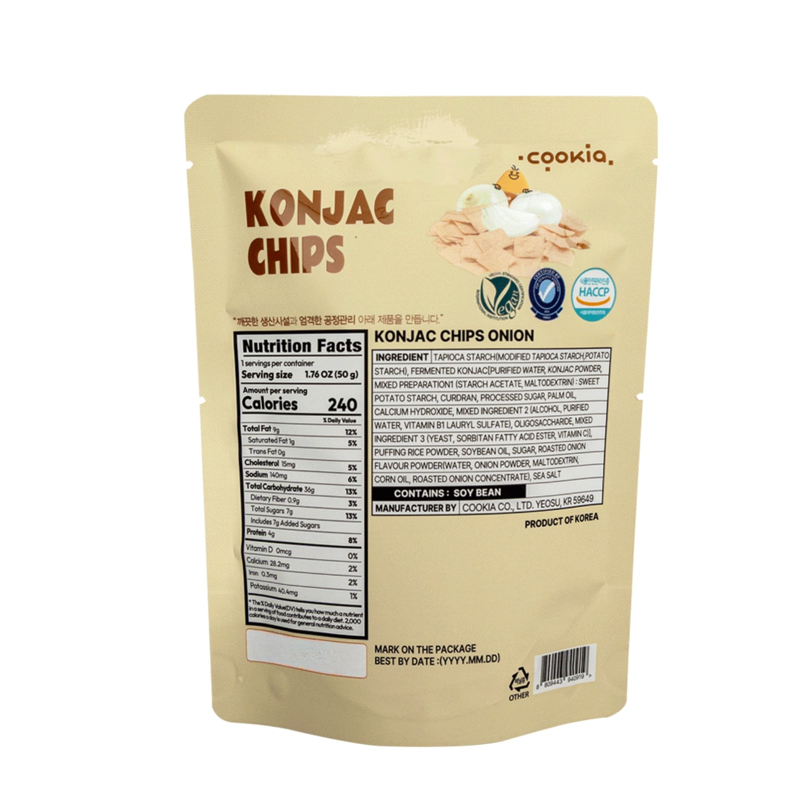 Elevate your snacking with Cookia Konjac Chips, 100% plant-based, flour and egg free delicacy that is vegan friendly and crafted for discerning taste. Made with fermented konjac, each chip delivers a delicate, crisp bite with a refined crunch and satisfying flavor. Using a patented Triple-Baked Process, the chips are lightly fried and baked three times in a far-infrared oven to remove excess oil, creating a perfectly crisp texture that locks in flavor. Produced in HACCP and SQF Level 3 certified facilities, with zero trans fat, no artificial colors, and no preservatives, Cookia Konjac Chips offer premium taste and quality you can enjoy with confidence. Available in Onion, Tteokbokki, and Seaweed flavors. Made in Korea.
