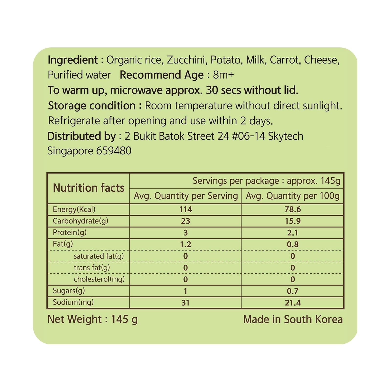 Eusik Baby Rice Porridges are delicate combinations of organic rice and wholesome ingredients from South Korea that are simmered to perfection. Based upon authentic Asian recipes, these simply delicious porridge are a great all-natural meal option for our little ones. Packed to the brim in eco-friendly, BPA-free glass bottles, it is ready-to-eat directly and makes feeding a breeze whether you are at home or out on impromptu outings/long journeys. When required, warm it up easily in a microwave or by soaking in hot water and be amazed by the enhanced fragrance and taste. A truly hygienic and nutritious meal anytime, anywhere!