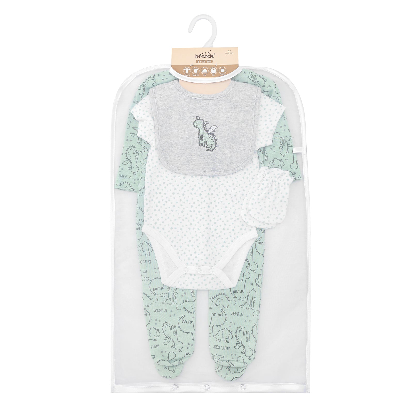Infancie 5-Pc Baby Layette Set - Grower, Bodysuit,Bib,Hat and Mittens (Green Dino)