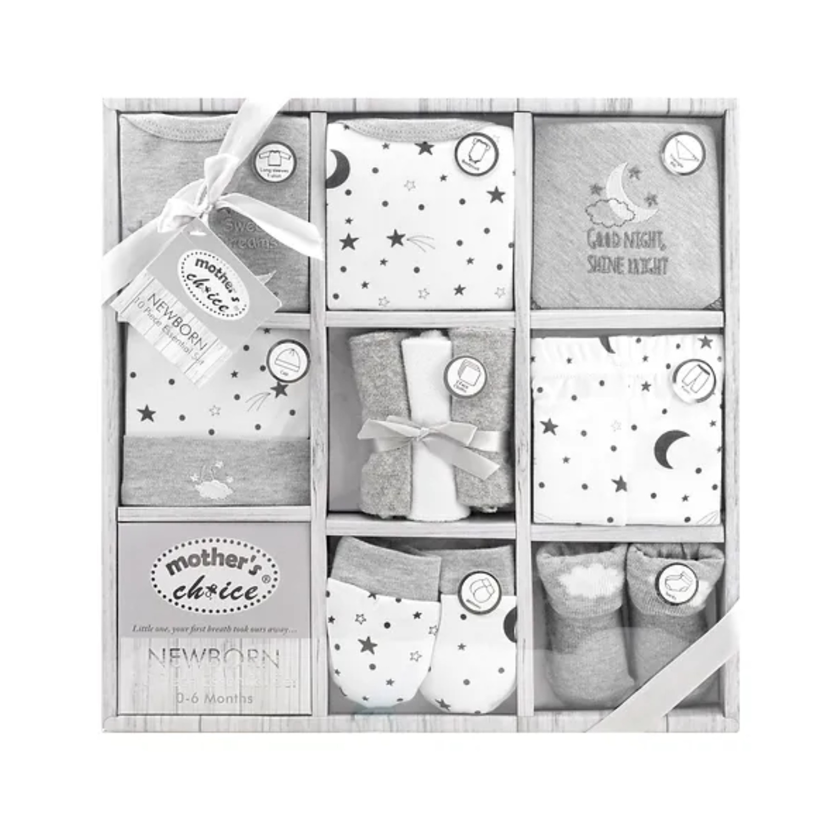 MOTHER'S CHOICE 10-Pc Baby Bodysuit, T-shirt, Pants, Hat, Mittens, Bib, Socks & Wash Cloths Gift Box Set (Grey)